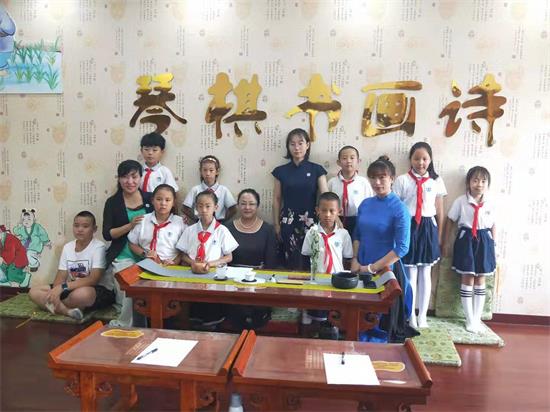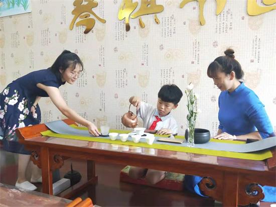 本网讯 8月12日,呼和浩特市赛罕区锡林南路小学分校三年级7班的雏鹰小队来到了玉泉区图书馆,组织了以“茶道礼仪、国学经典”为主题的假期实践活动。茶艺老师教同学们学习茶艺茶礼,了解茶文化,体会其中所蕴含的传统文化,同时国学老师为家长们讲解中国悠久的历史文化传统。