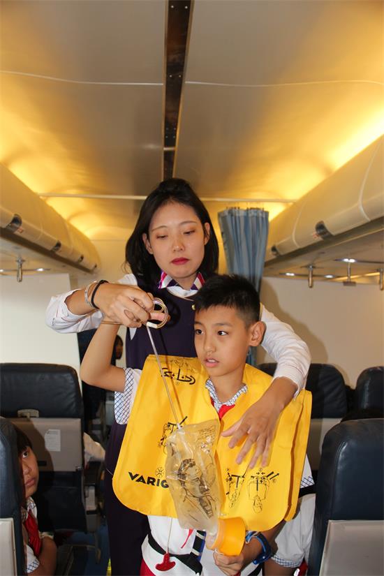 最后,队员们进去了模拟机舱,由专业人员介绍在开始飞行之前乘机人员应做好的安全准备。队员们实际操作,记忆、体会更加深刻。