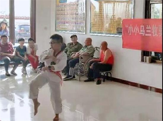 志愿者们的才艺节目真是丰富多彩。有古典乐器的古筝、琵琶,有节奏感十足的现代舞,有优美动听的草原歌曲,还有所向披靡的跆拳道。大厅里不时传出老人们热烈的掌声,还有的老人为小队员们竖起了大拇指。