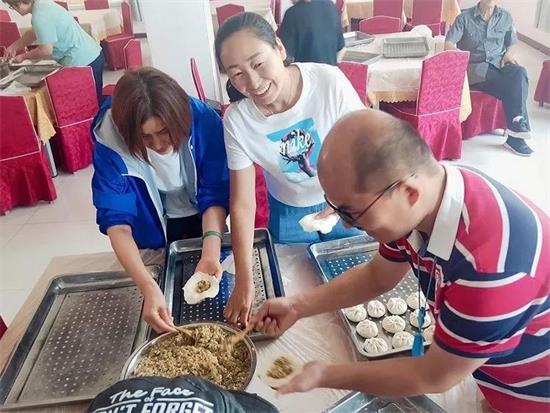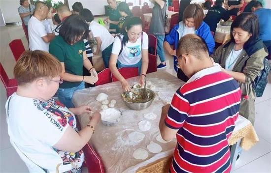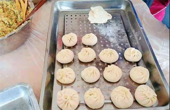 孩子们传递快乐,大人们也没闲着。大家一起走进餐厅厨房,和面、拌馅、擀皮、包包子。不一会,白白胖胖的包子就出锅了。